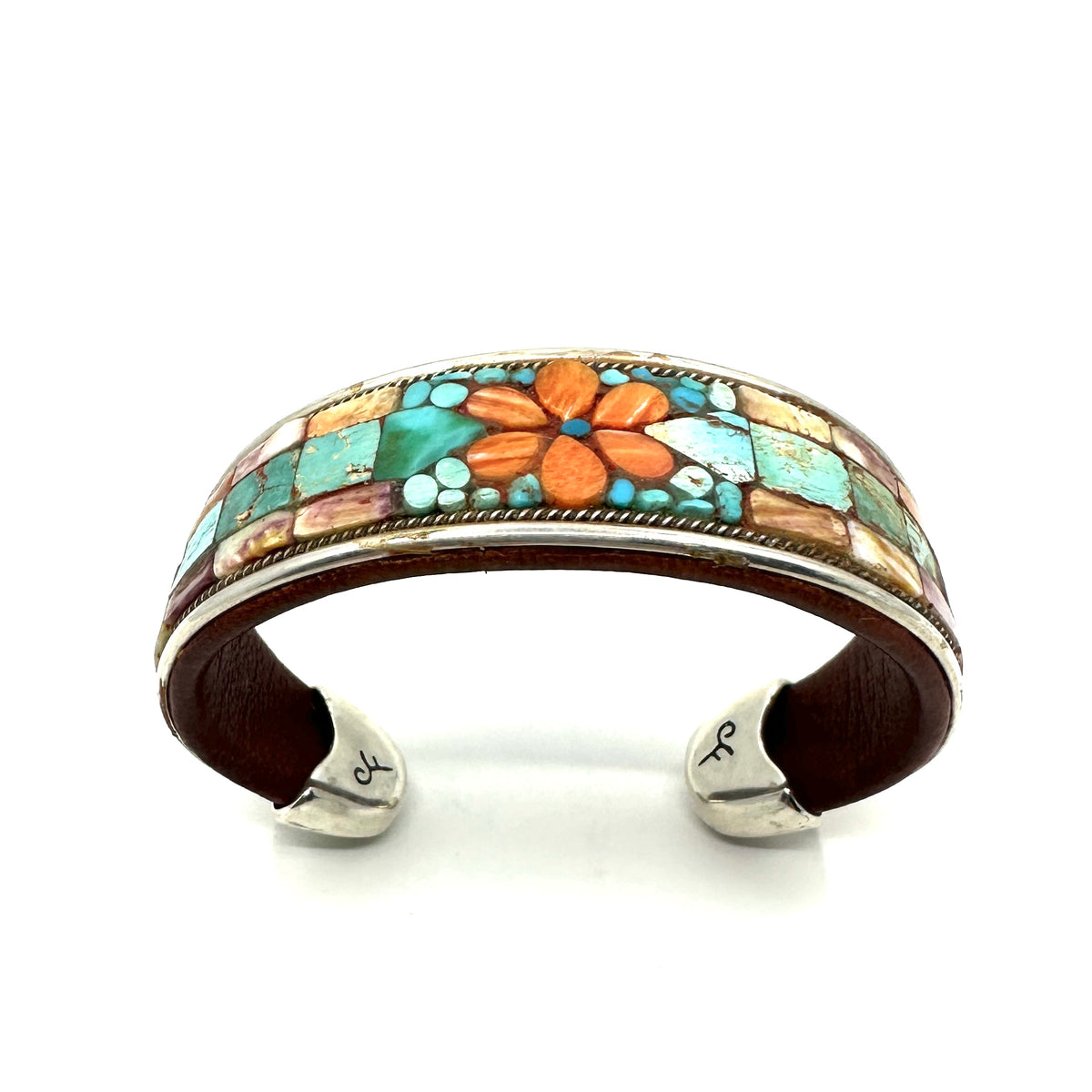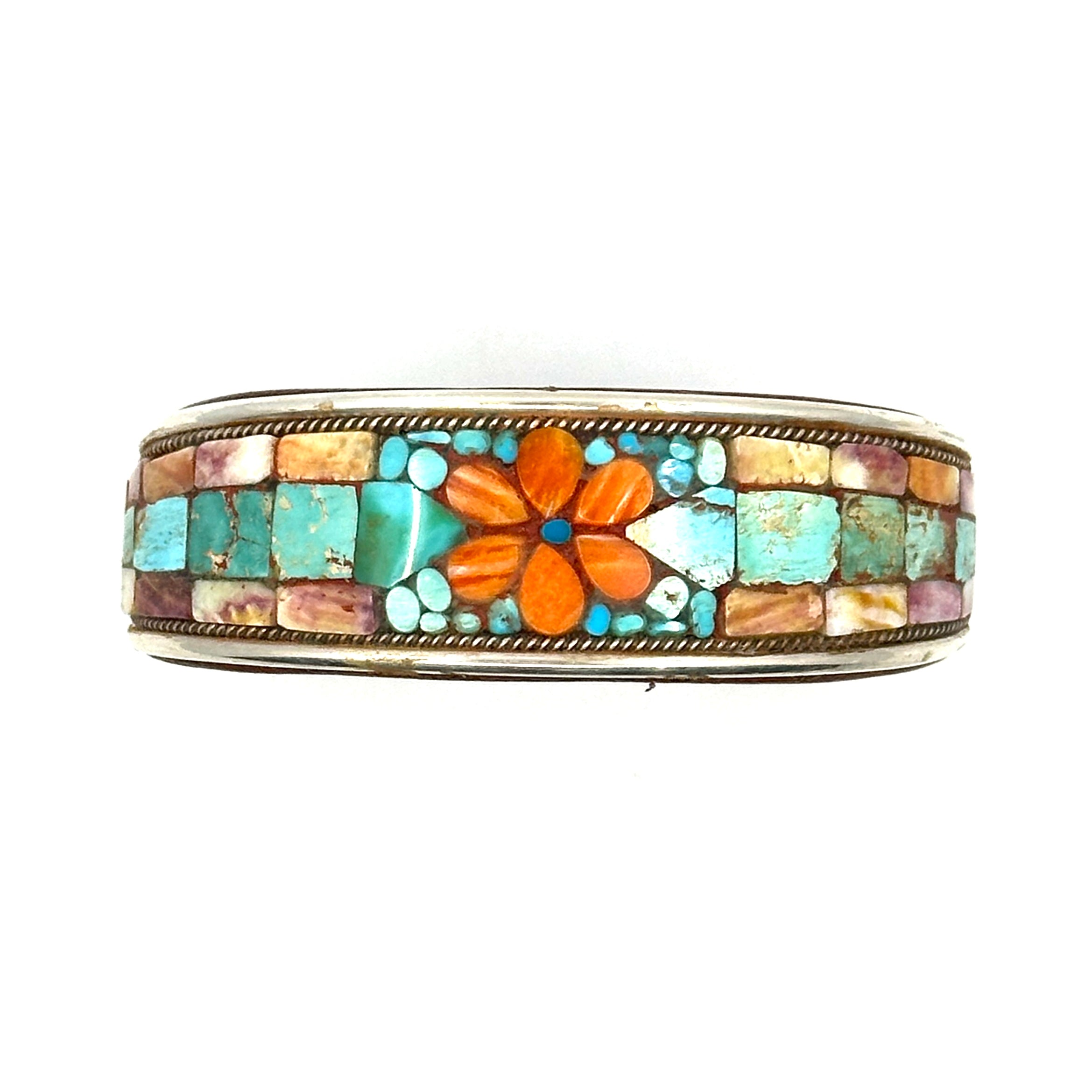 Charlie Favour Turquoise Inlay Cuff with Spiny Oyster Shell Flower