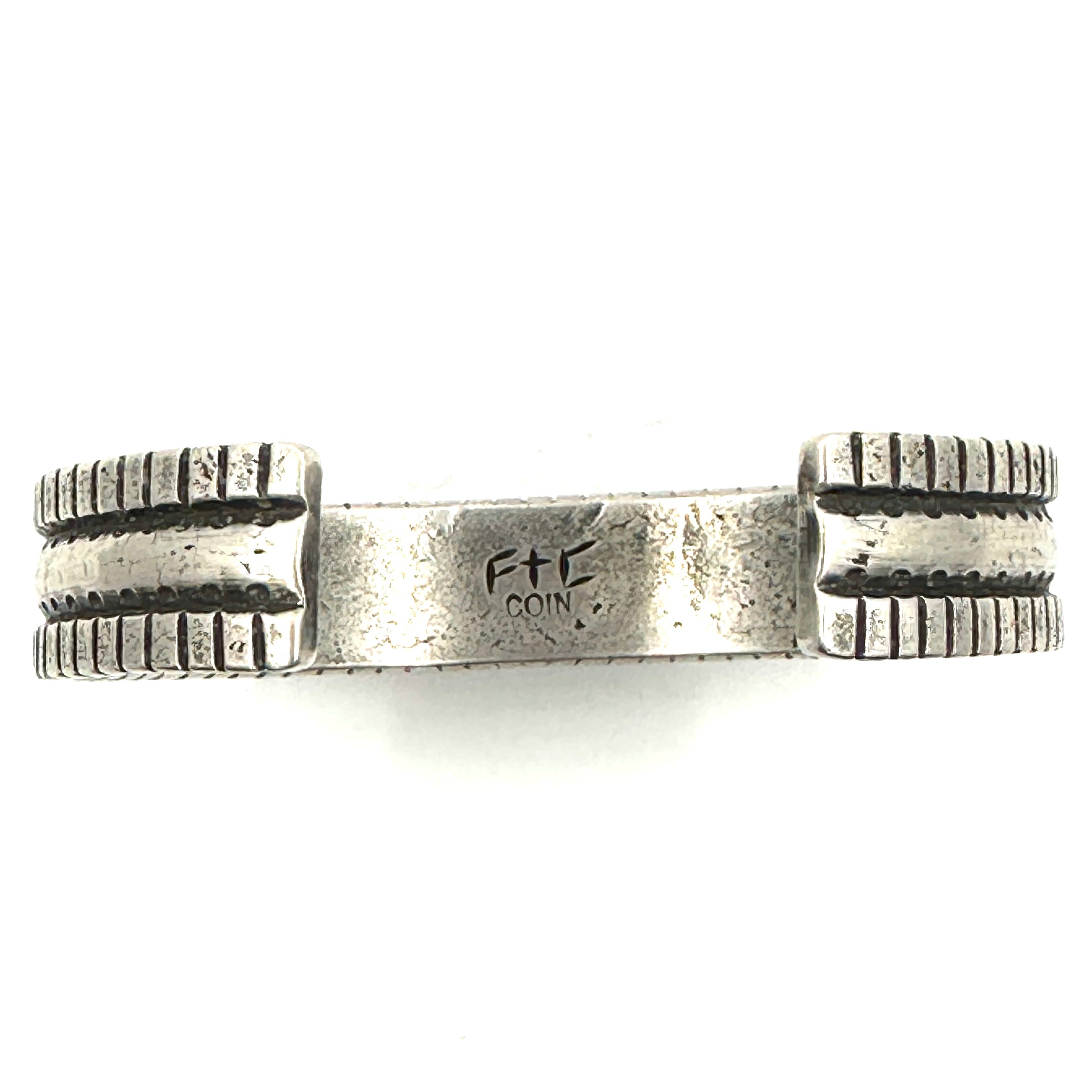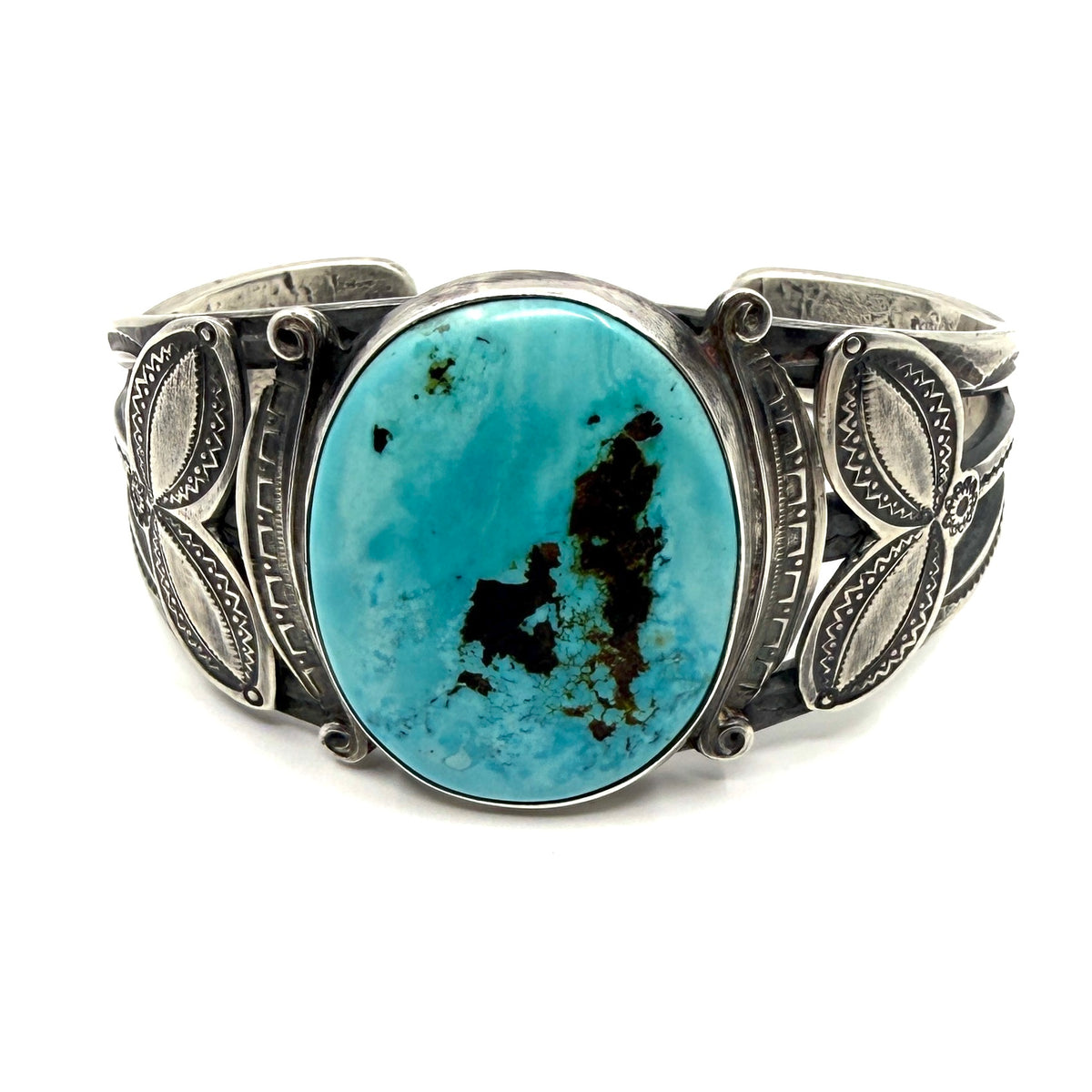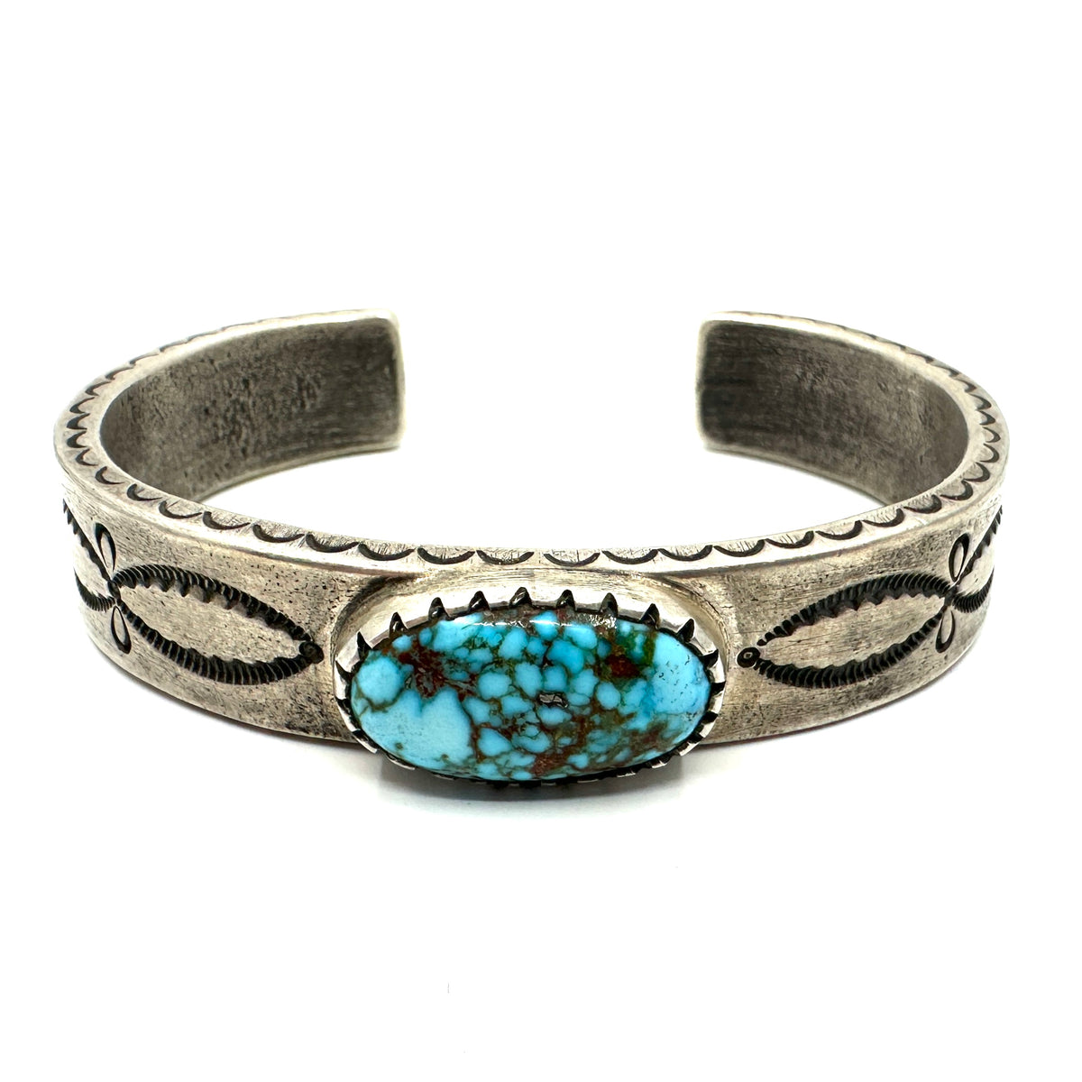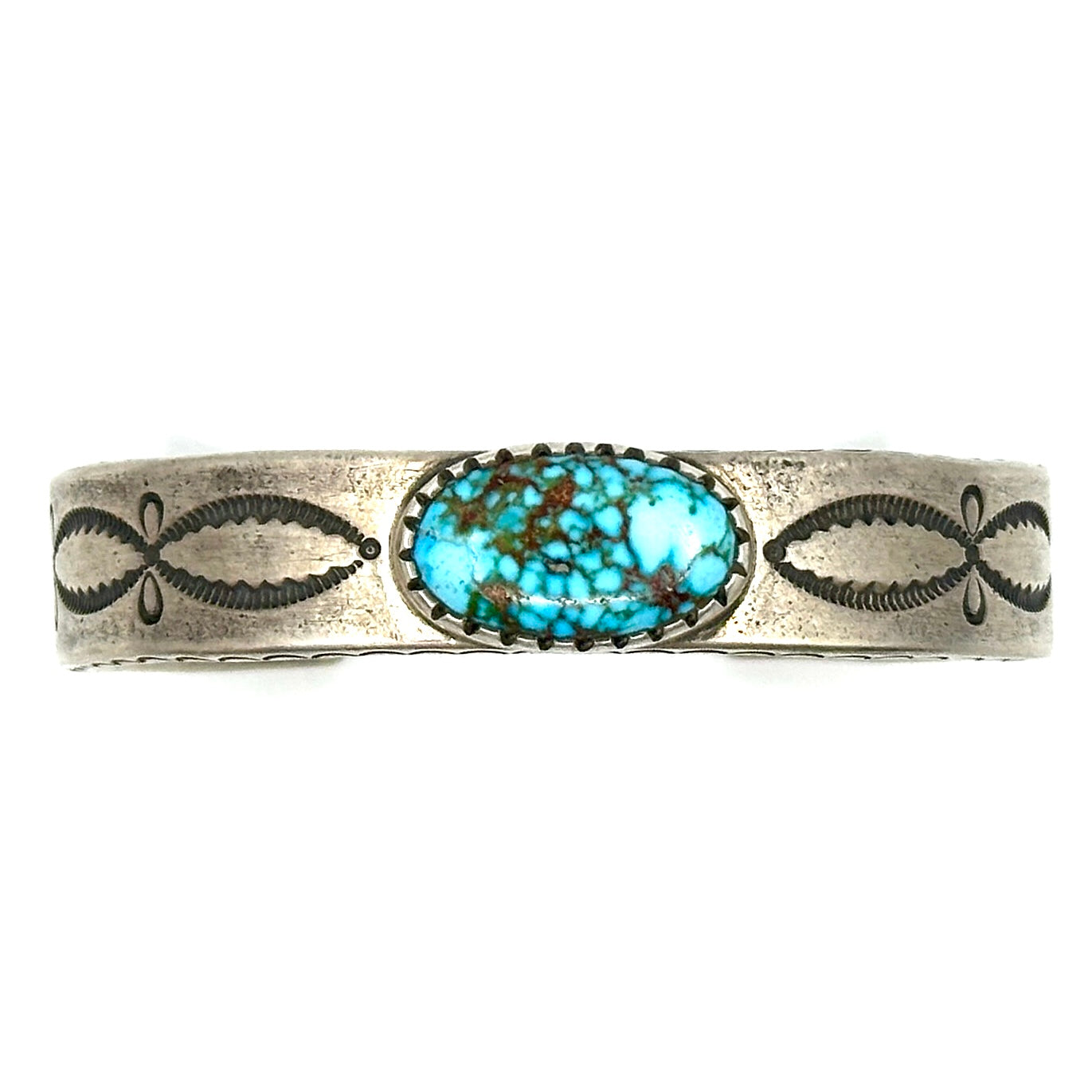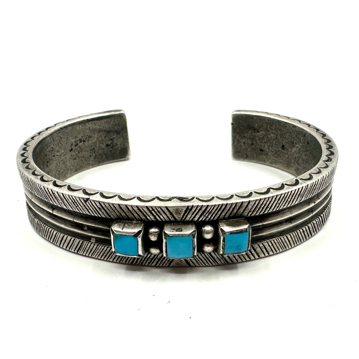 Heavy Silver Stamped Bracelet with Kingman Turquoise by Joe O'Neill (Falcon Trading Company)