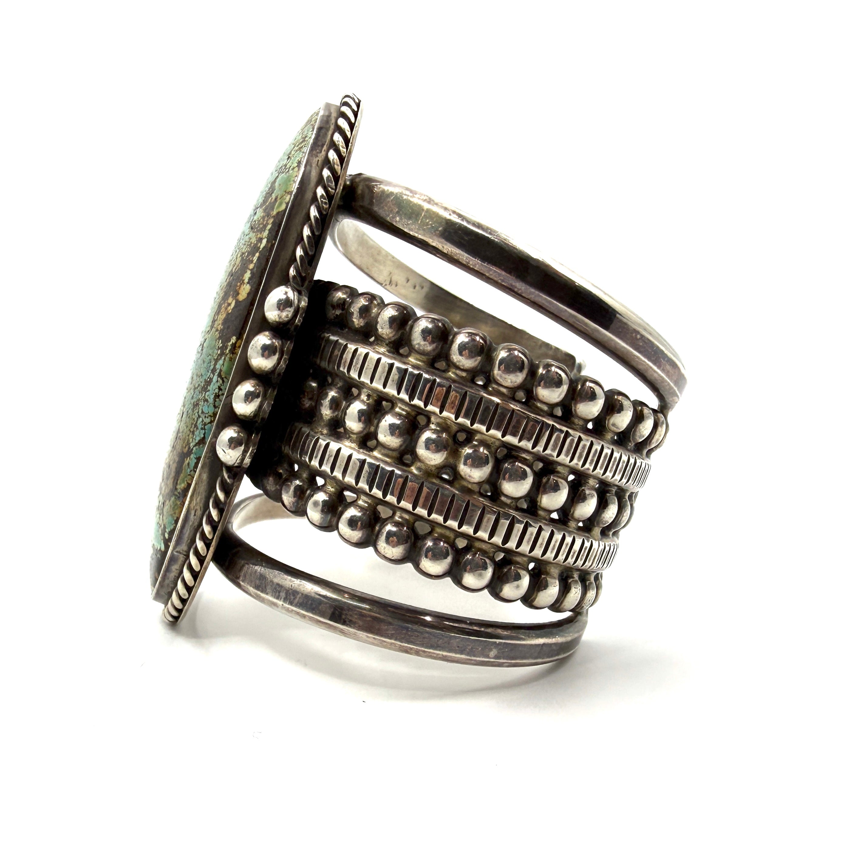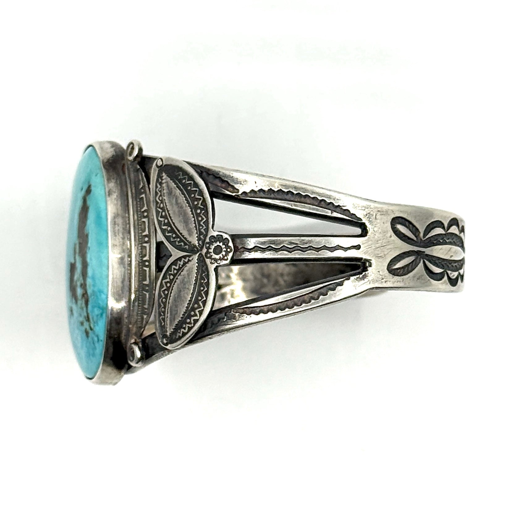 Vintage Ingot Split Shank Bracelet with Large Turquoise Stone and Applique Stamp Work
