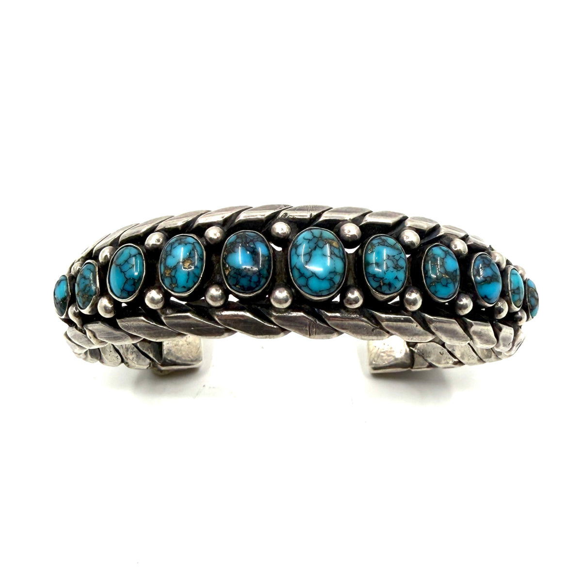 Vintage Formed Twist Wire Row Bracelet with 11 High-Grade Lone Mountain Turquoise Stones