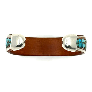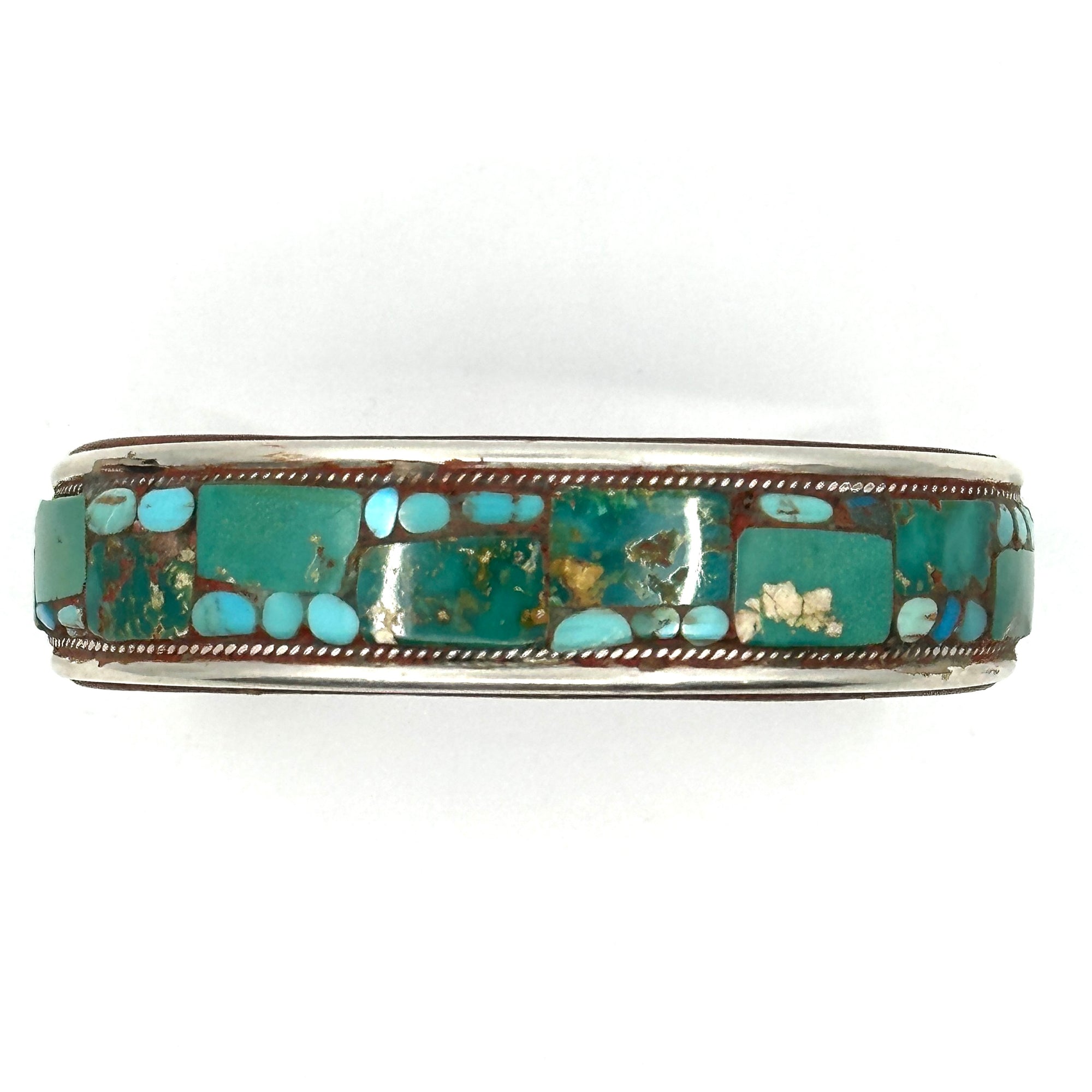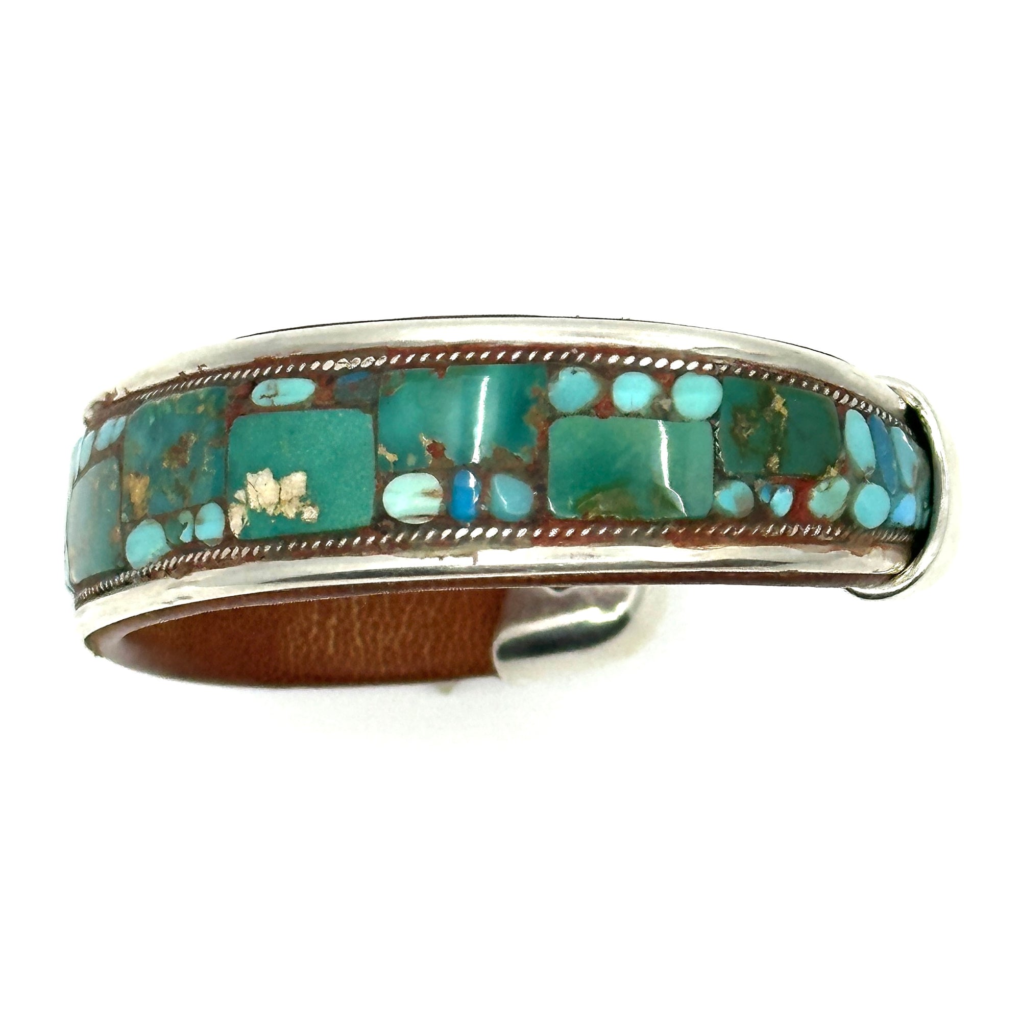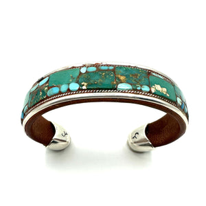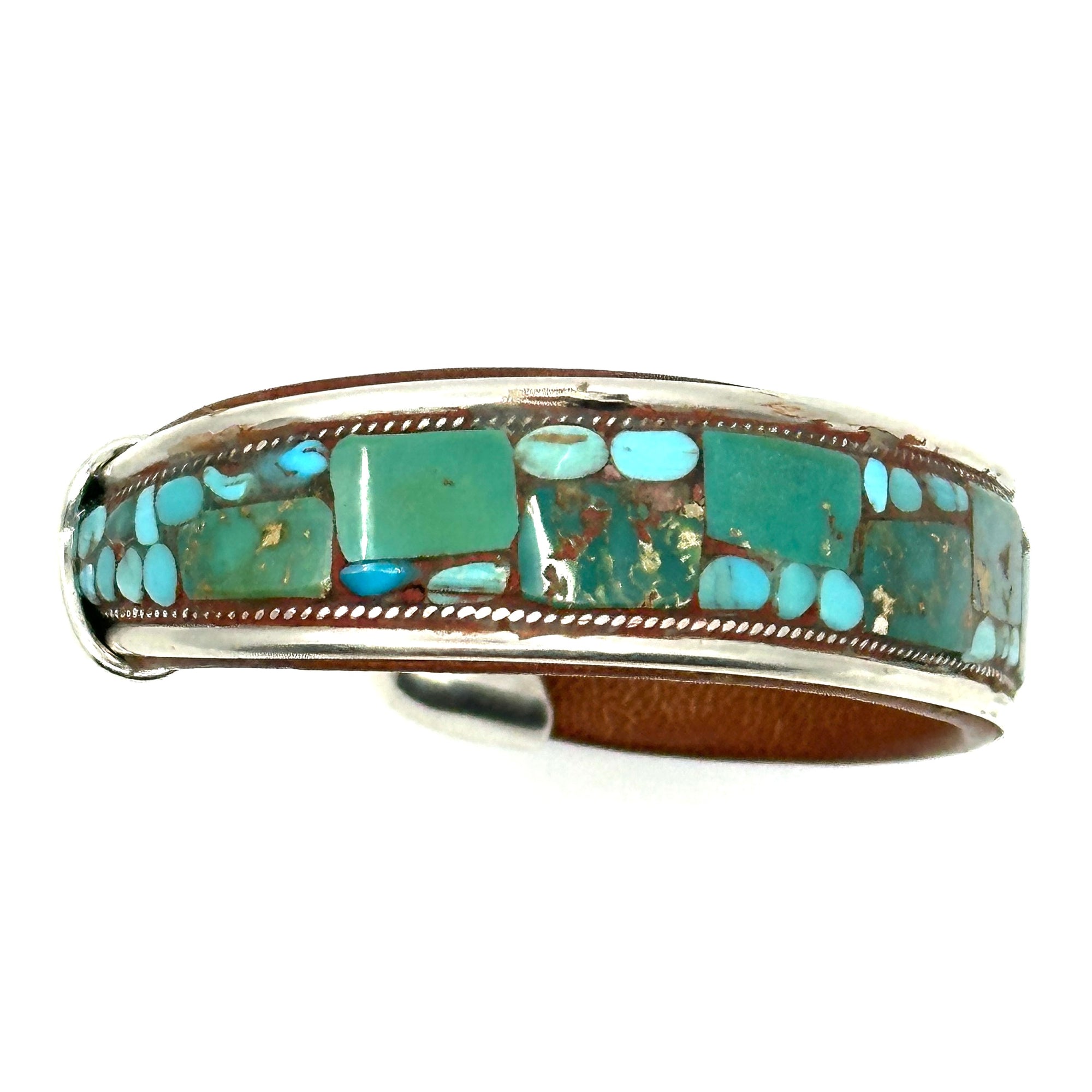 Handmade cuff by Charlie Favour. Sterling Silver, Copper and leather with mosaic inlaid Turquoise.