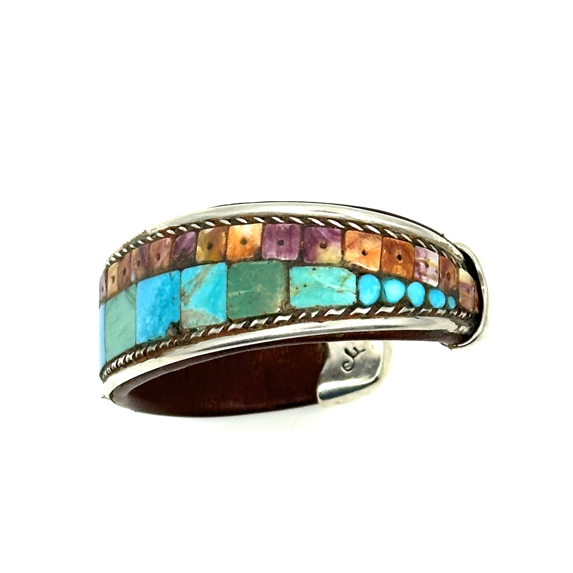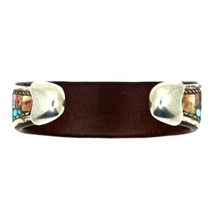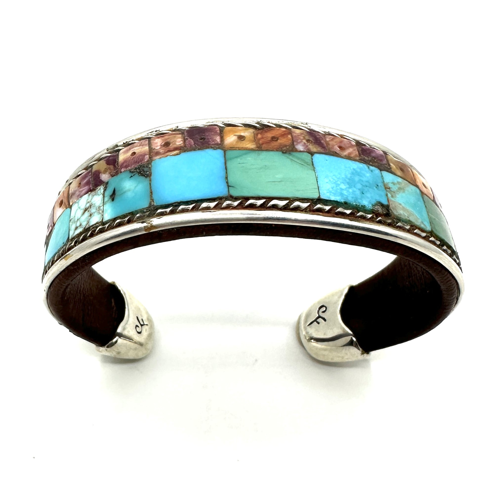Handmade cuff by Charlie Favour. Sterling Silver, Copper and leather with mosaic inlaid Turquoise and Spiny Oyster shell.