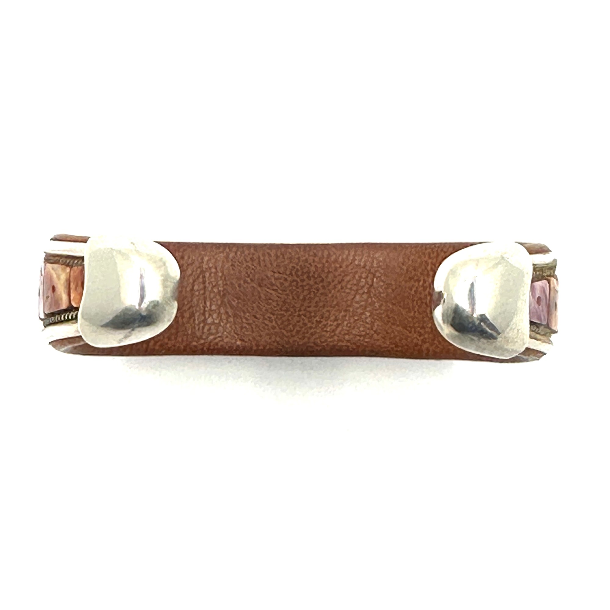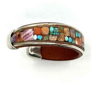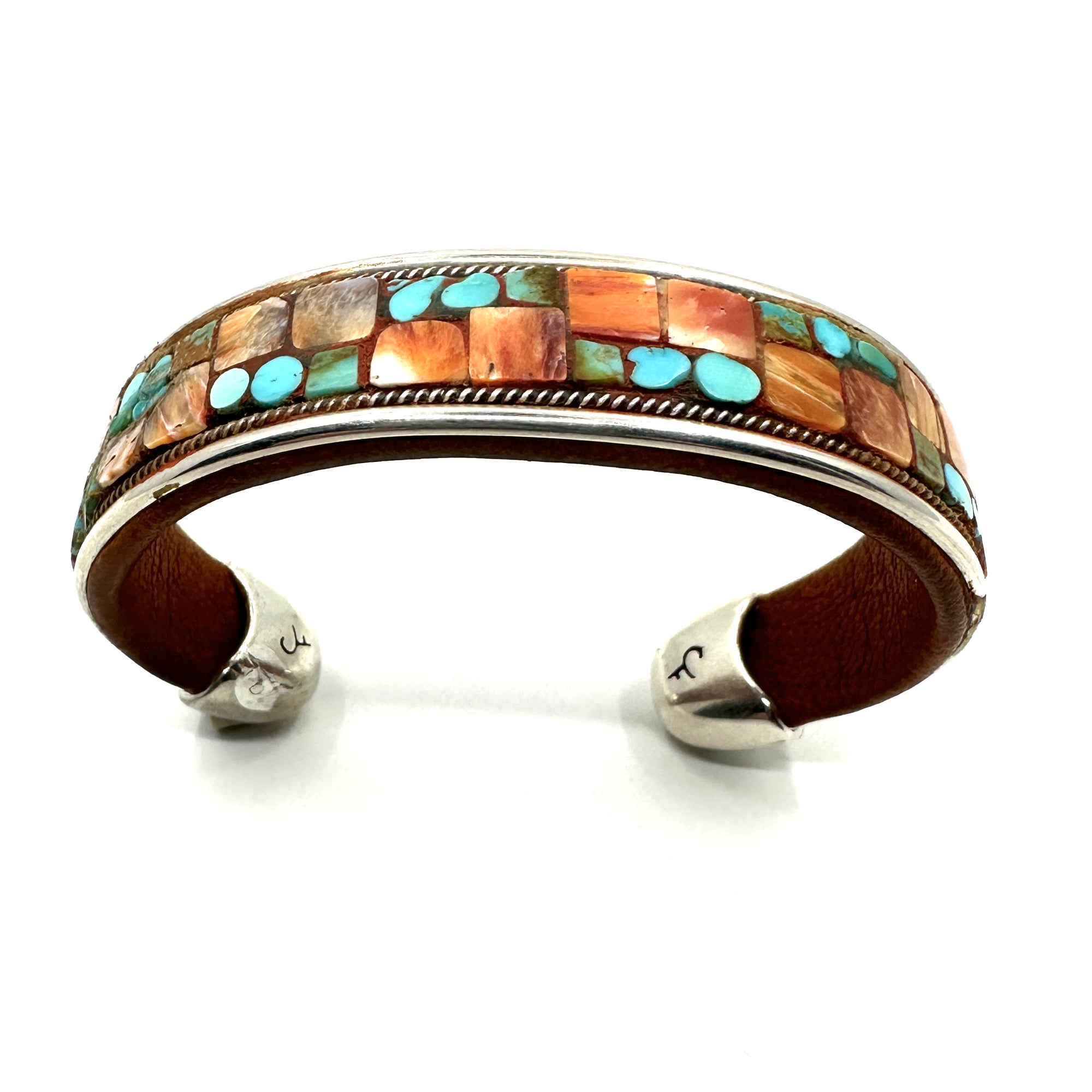 Handmade cuff by Charlie Favour. Sterling Silver, Copper and leather with mosaic inlaid Turquoise and Spiny Oyster shell.