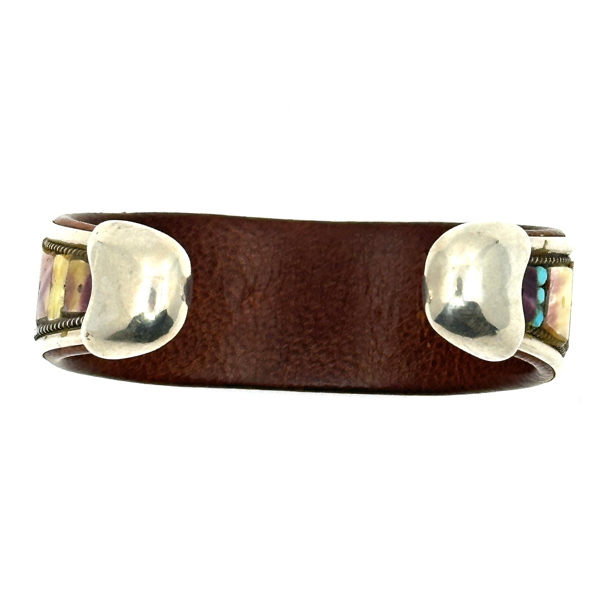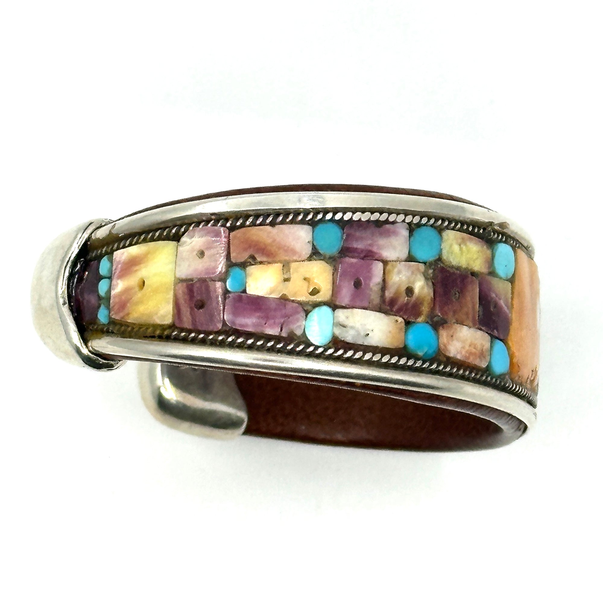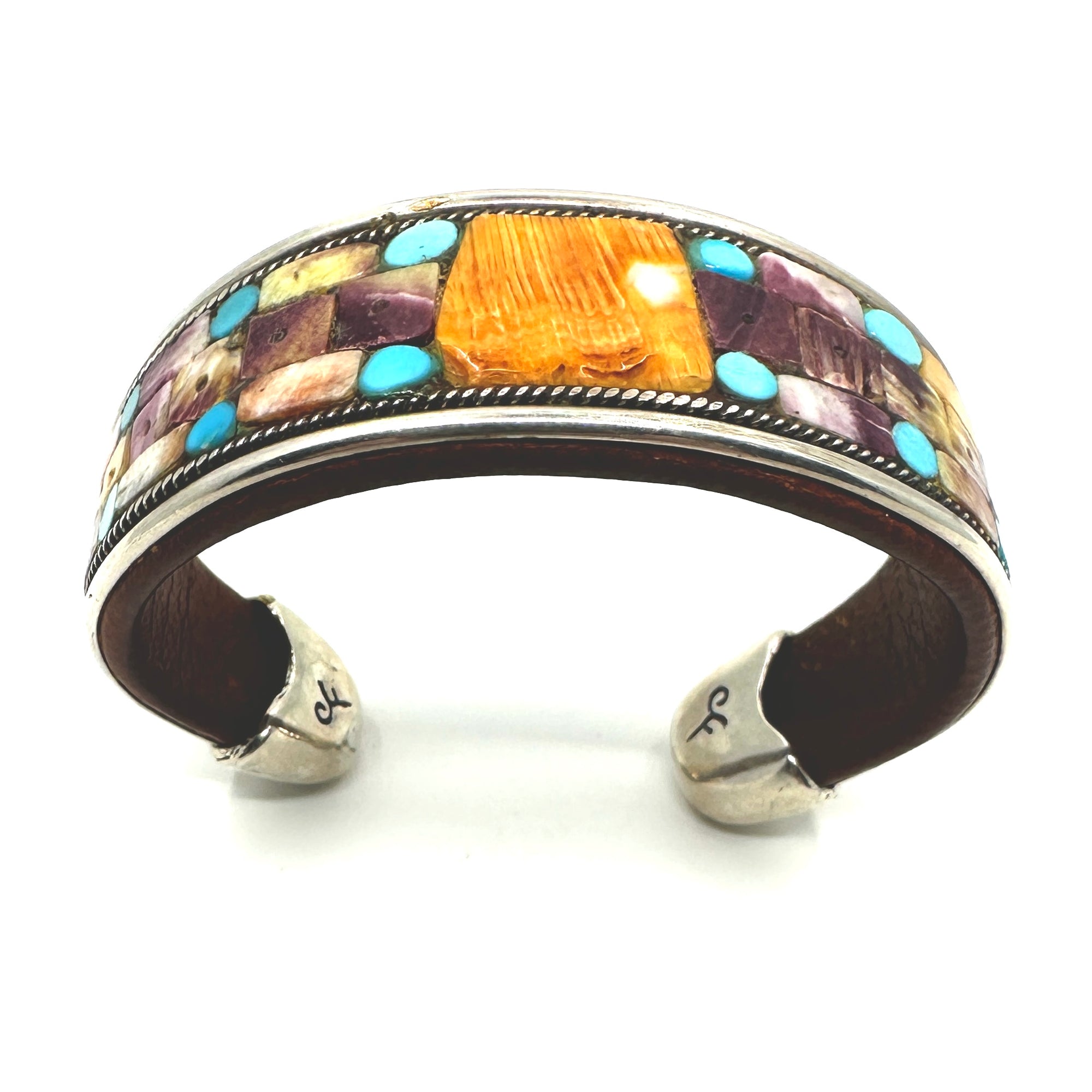 Handmade cuff by Charlie Favour. Sterling Silver, Copper and leather with mosaic inlaid Turquoise and Spiny Oyster shell.