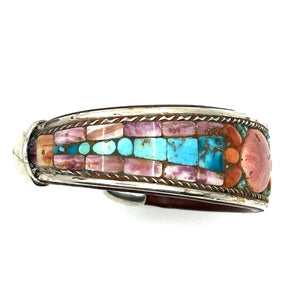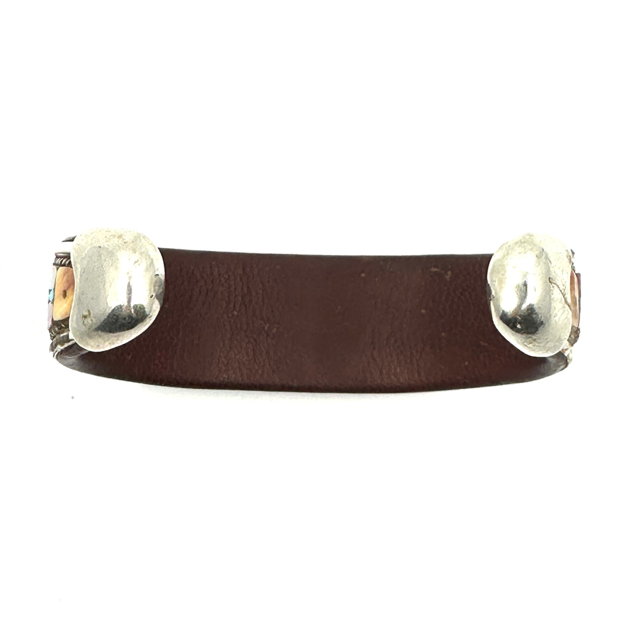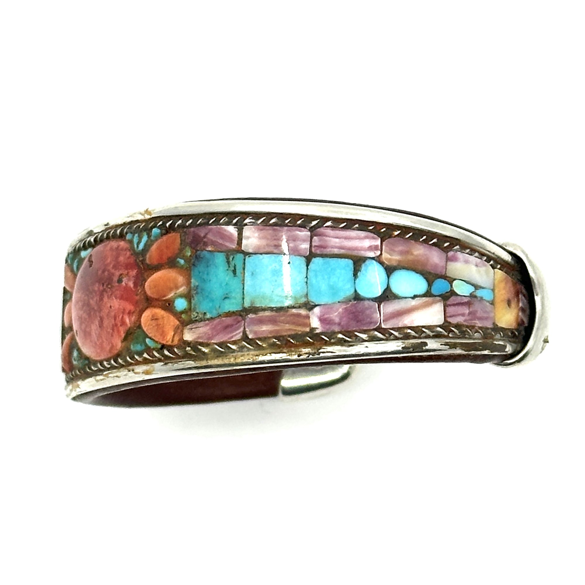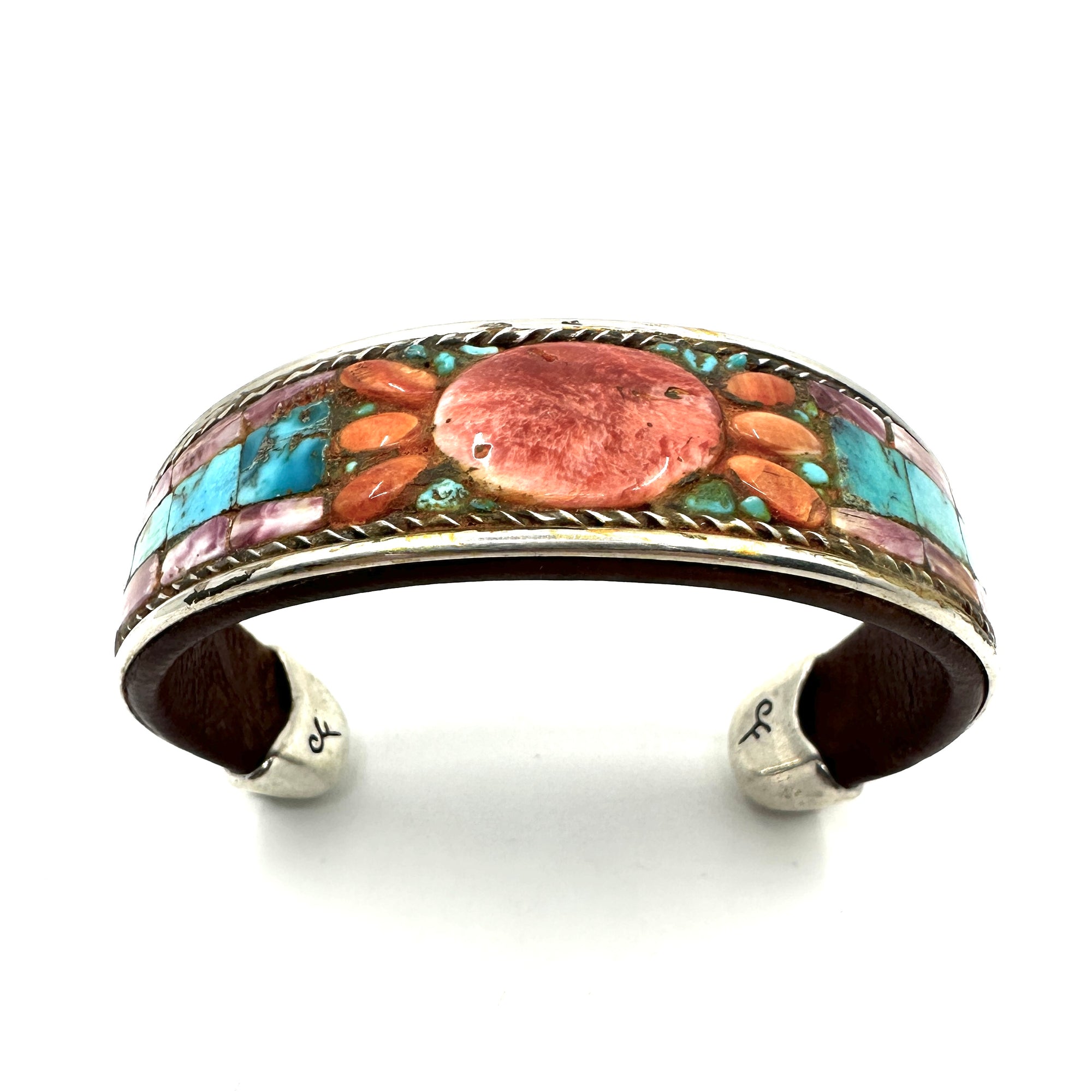 Handmade cuff by Charlie Favour. Sterling Silver, Copper and leather with mosaic inlaid Turquoise and Spiny Oyster shell. There is a beautiful oval design highlighted in the piece.