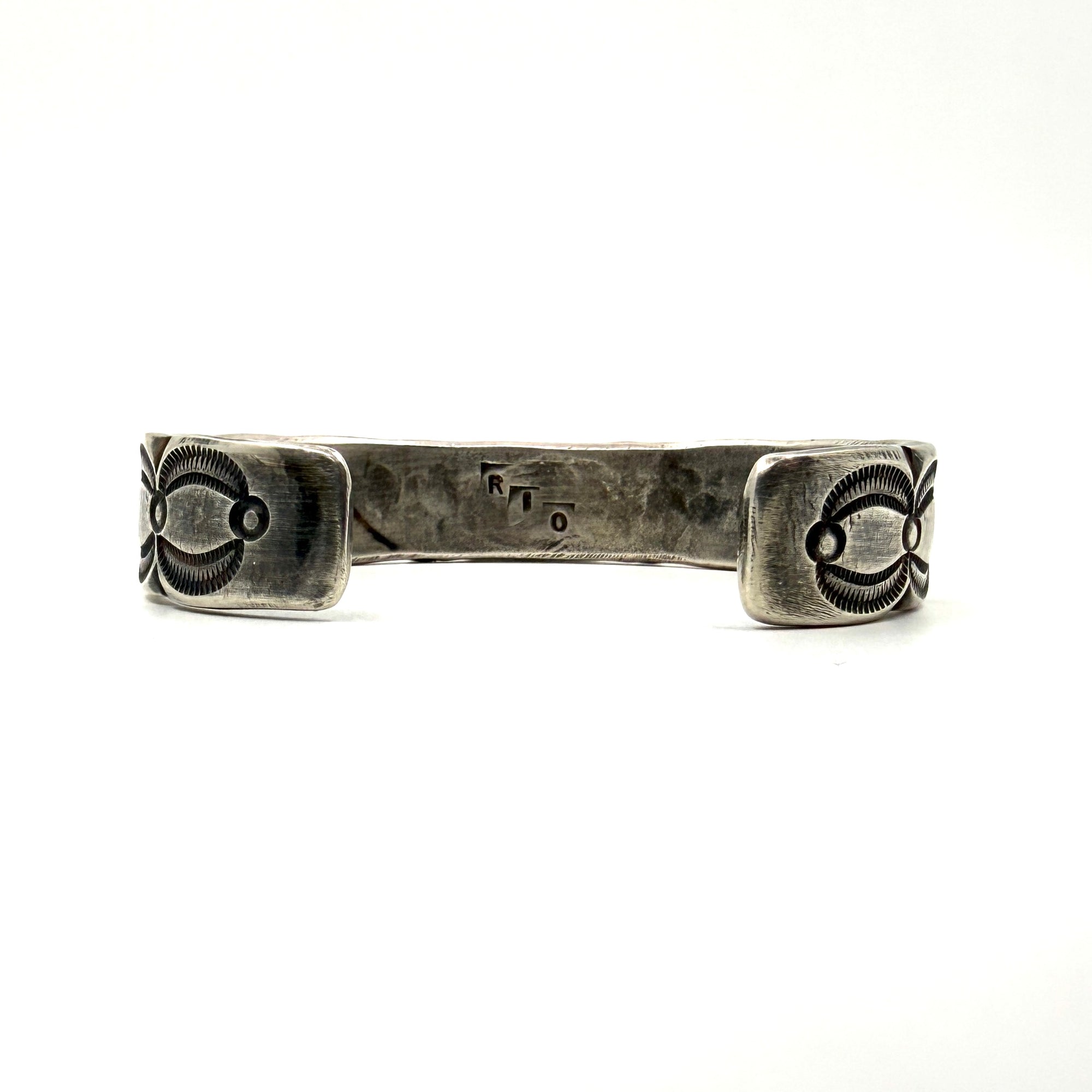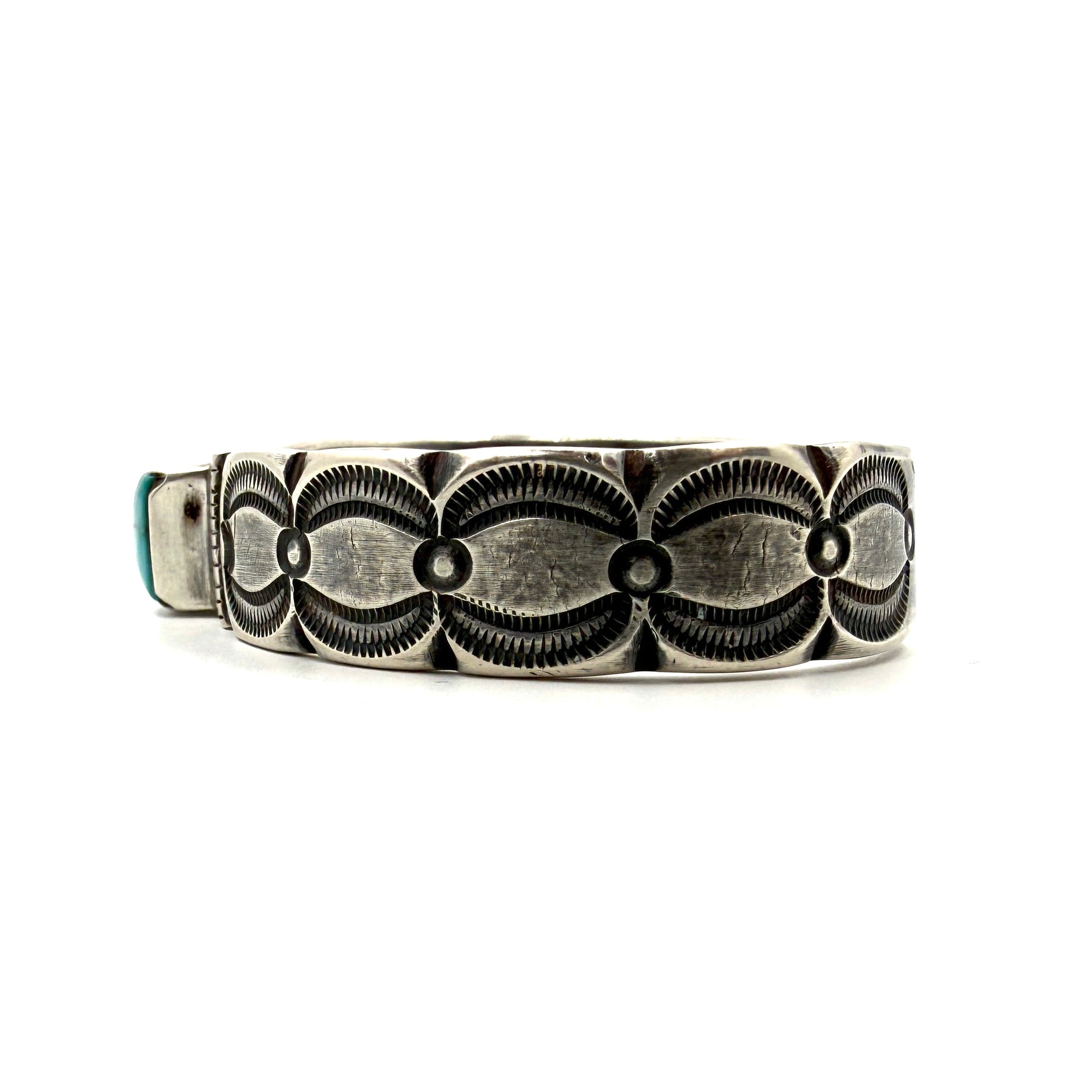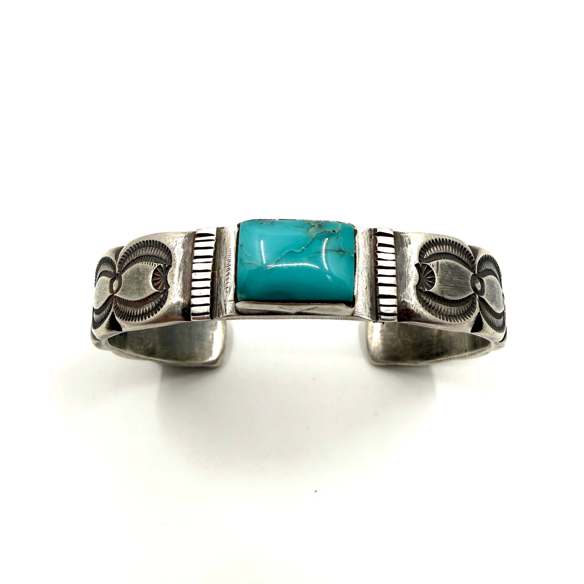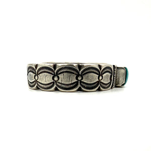 This bracelet is made from a tufa cast sterling silver ingot and features beautiful stampwork, set with a Fox Turquoise stone. Hallmarked: RIO