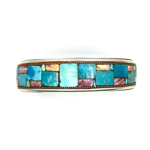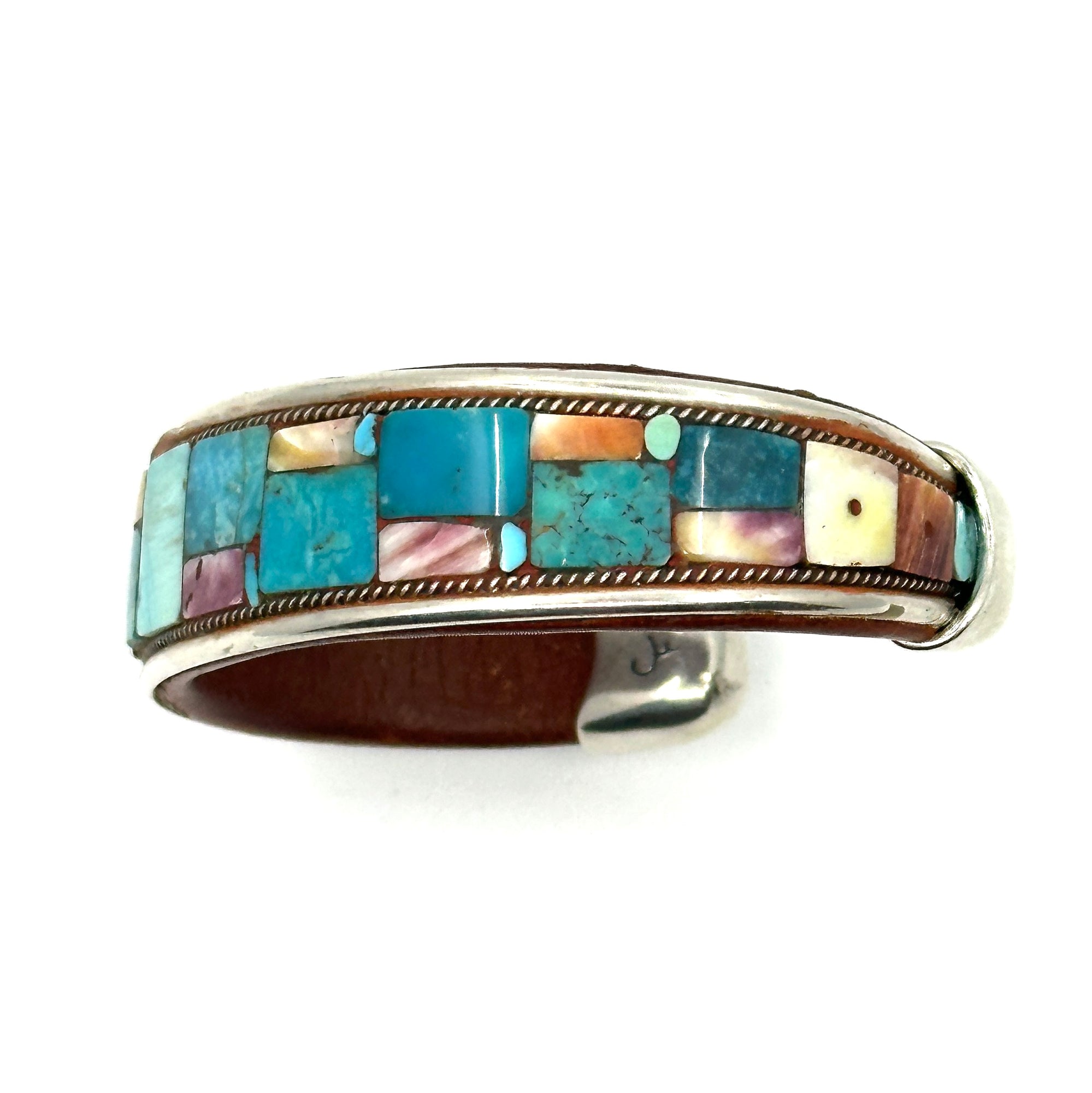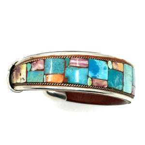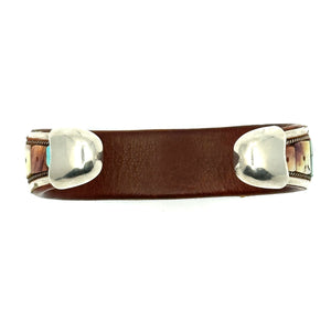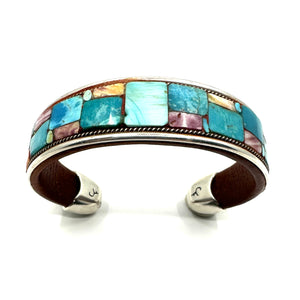 Handmade cuff by Charlie Favour. Sterling Silver, Copper and leather with mosaic inlaid Turquoise and Spiny Oyster shell.