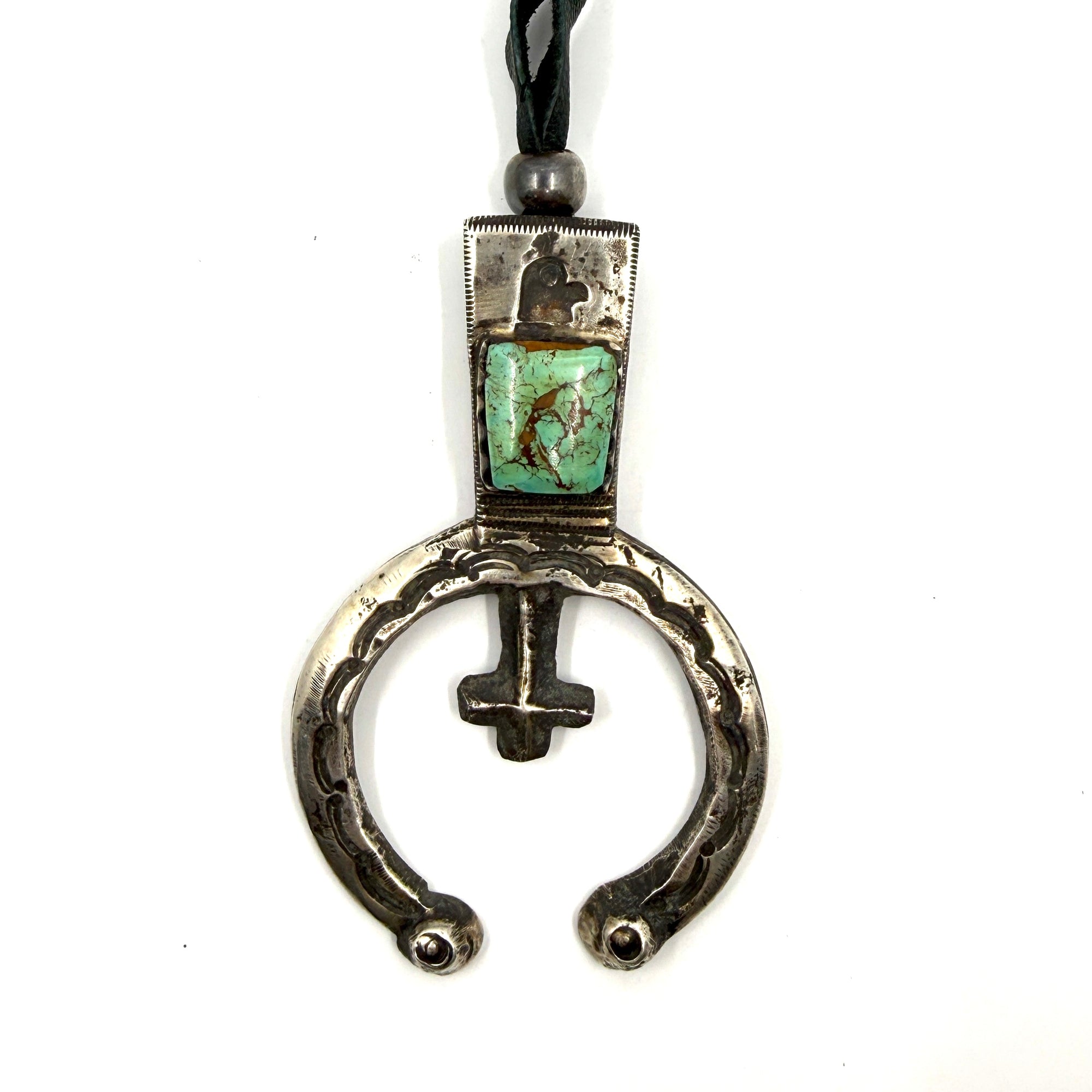 A heavy silver naja with a large turquoise stone inlaid in the top of it. Hung on black leather with 2 silver beads.