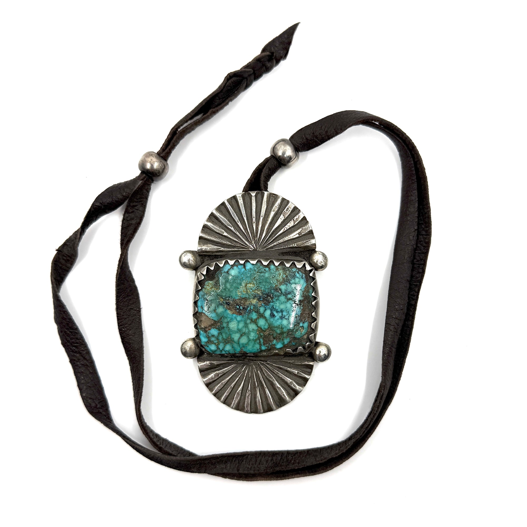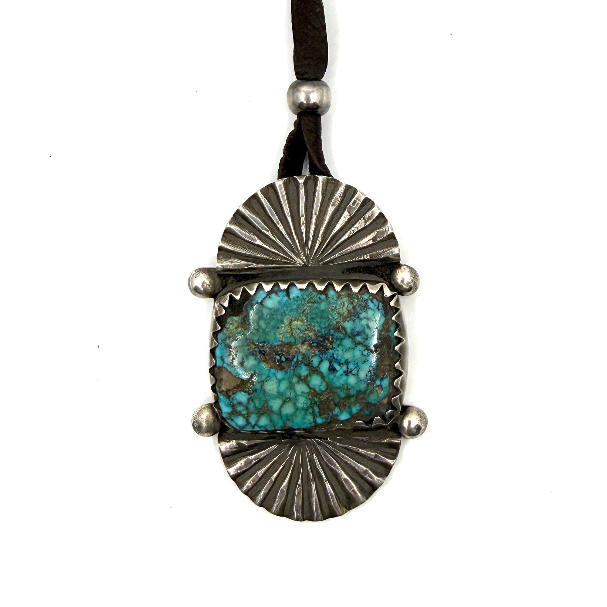 A large turquoise stone set in between two silver fans hung on black leather with two silver beads.