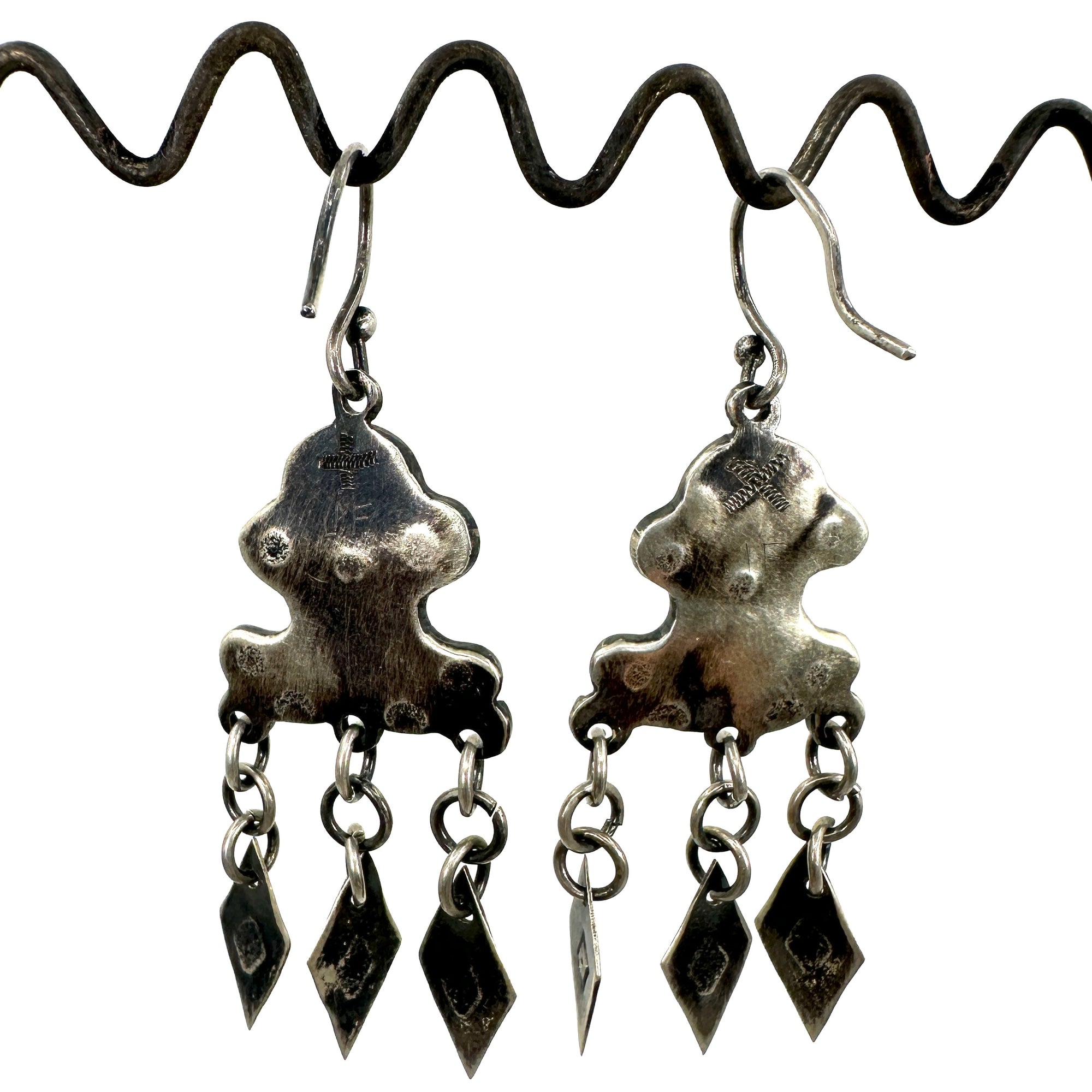 Coin silver hand stamped and fabricated dangle earrings emulating early Navajo and Pueblo earrings.