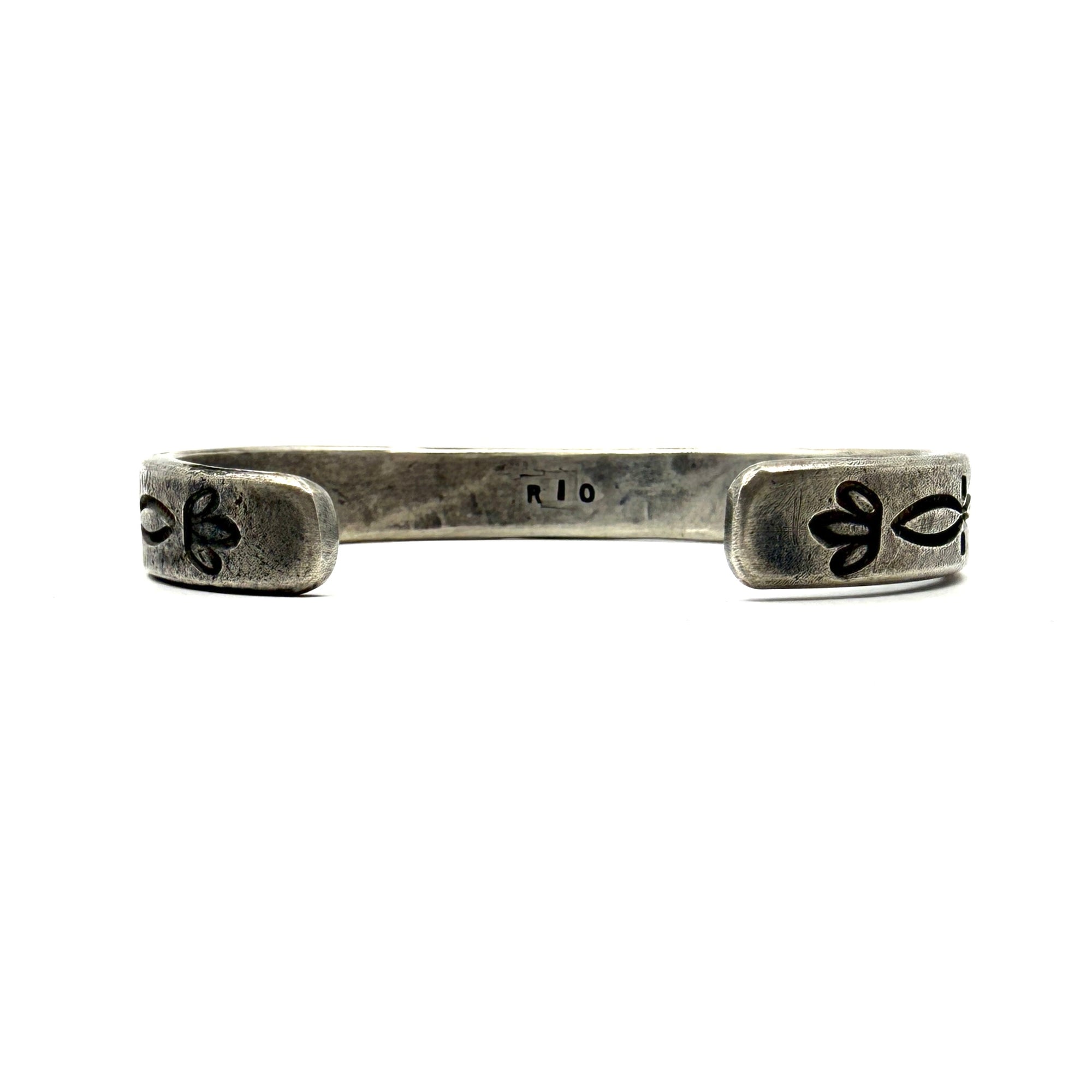 This is a tufa cast sterling silver bracelet that is hand-stamped, shaped, and filed. It is set with a Kingman Turquoise Stone. Hallmark: RIO