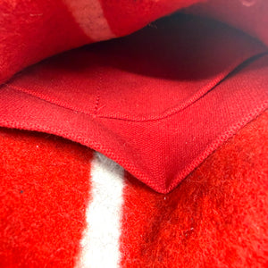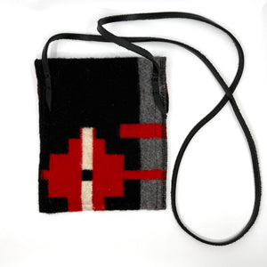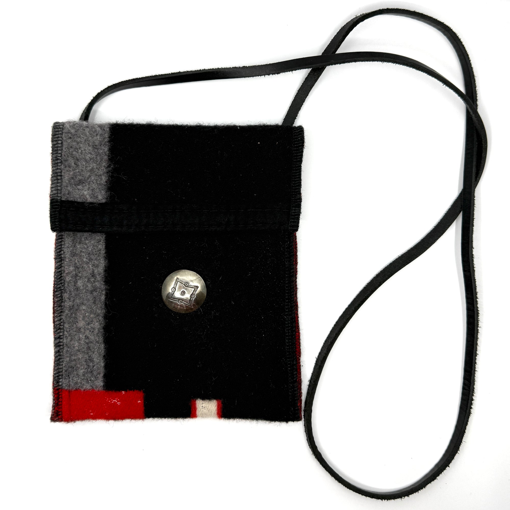 Repurposed wool Pendleton blanket purse with snap closure and vintage silver button accent by Pam Robbins. It has a 42" leather strap and 2 inner red canvas pockets.