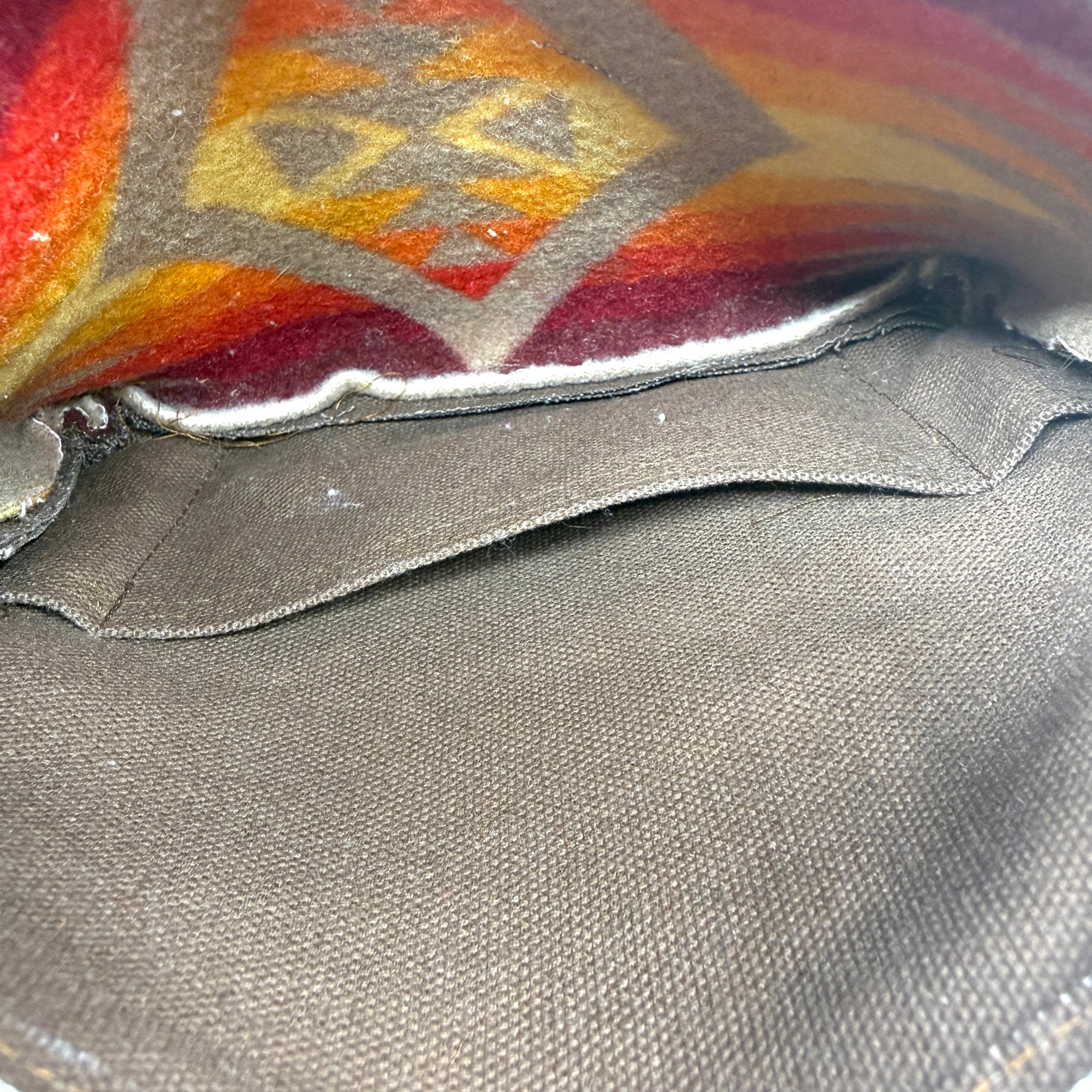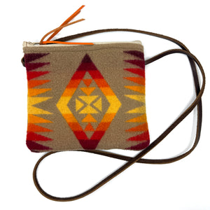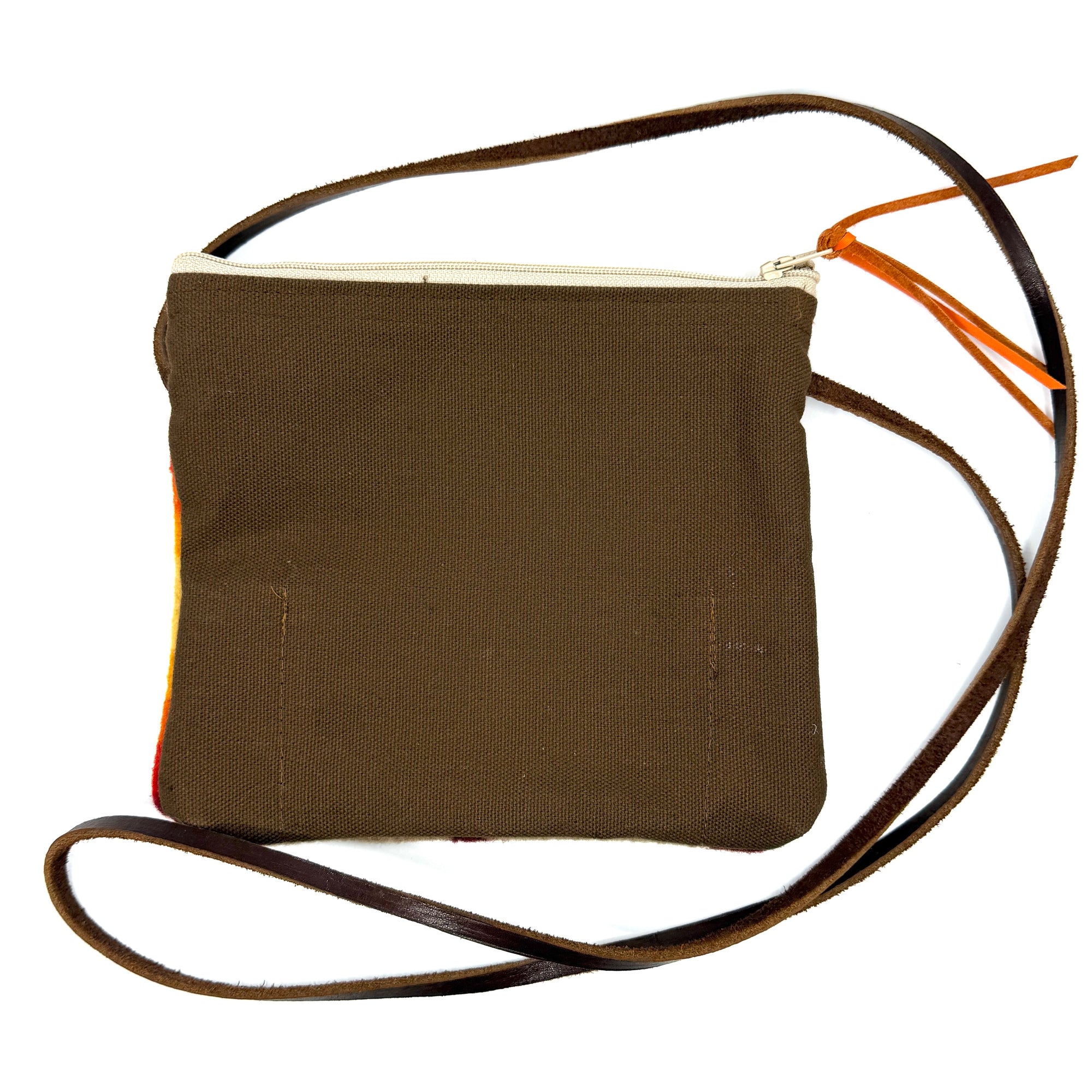 Repurposed wool Pendleton blanket purse with a brown canvas backside and one canvas inner open pocket by Pam Robbins. Zipper closure with orange leather zipper pull.