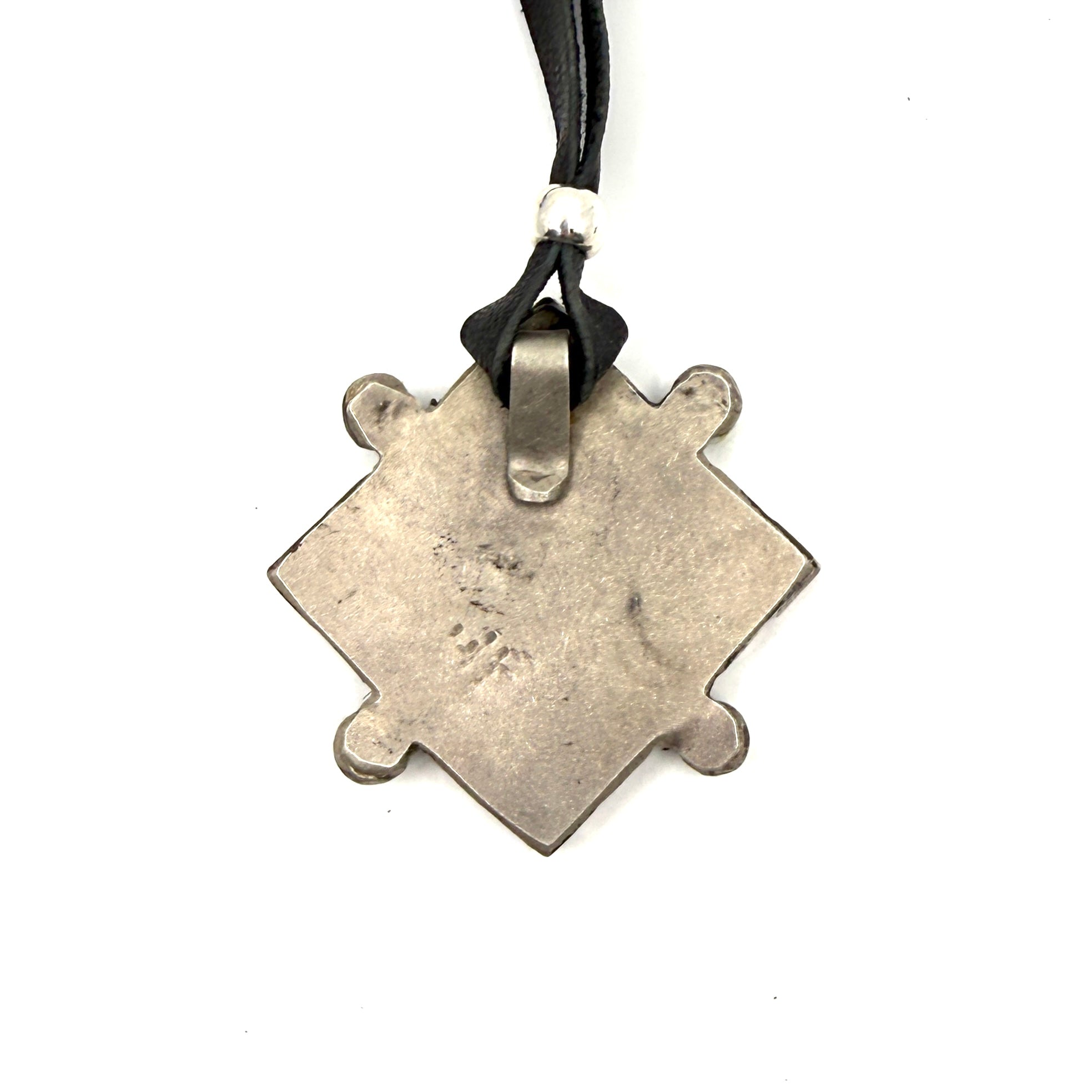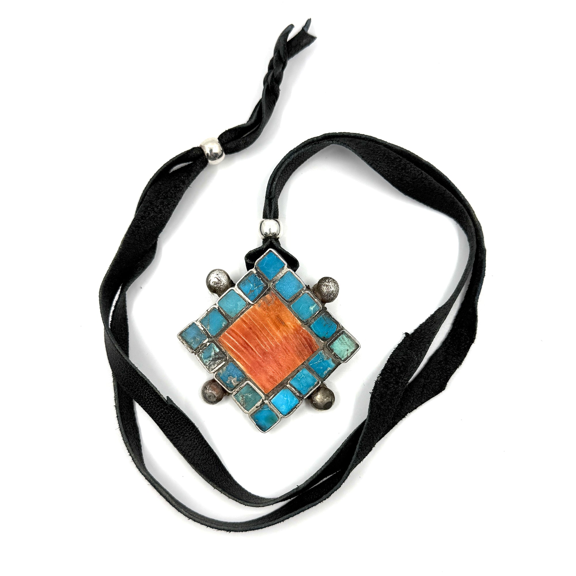 This pendant features a center square of spiny oyster shell surrounded by turquoise. It is hung on black leather with 2 silver beads.