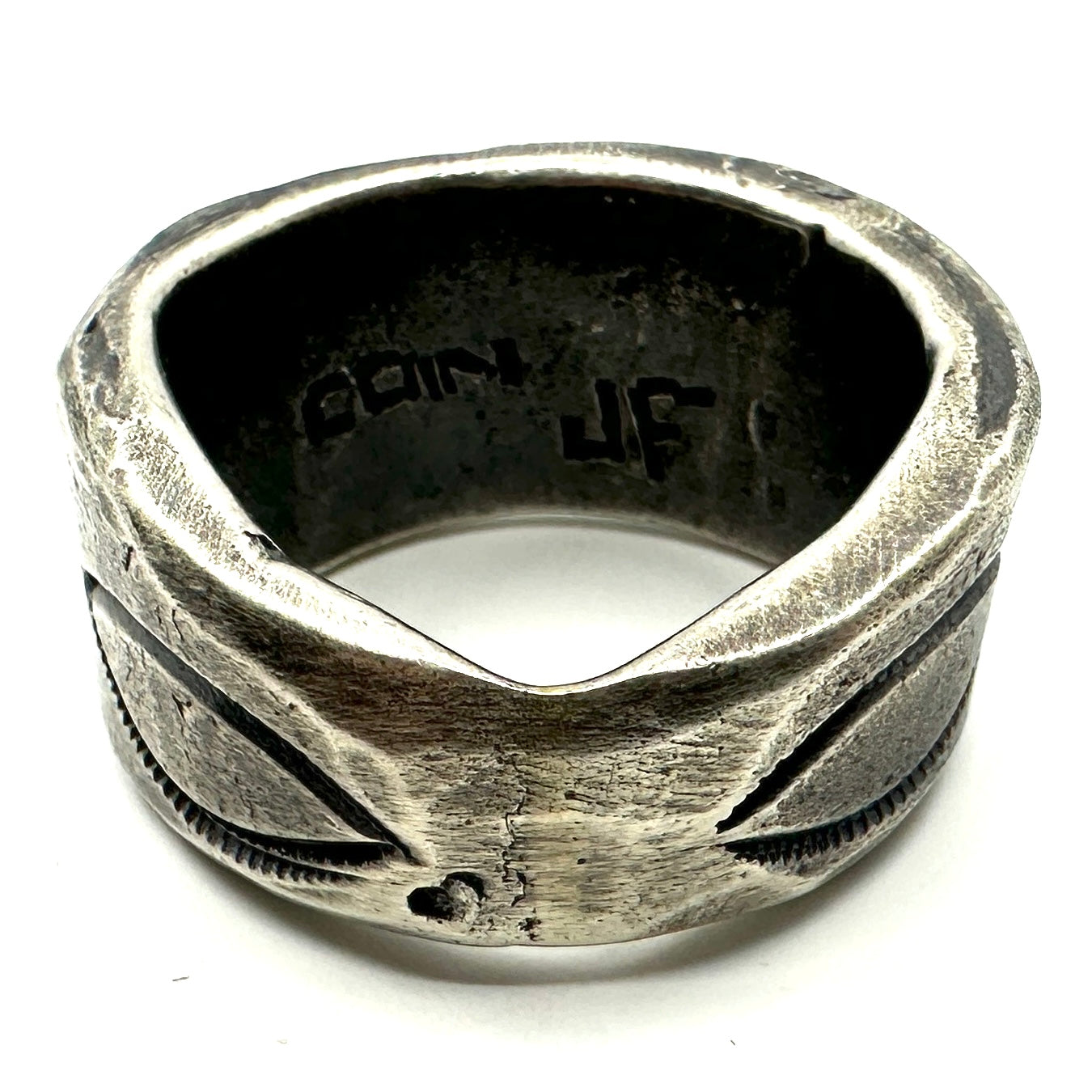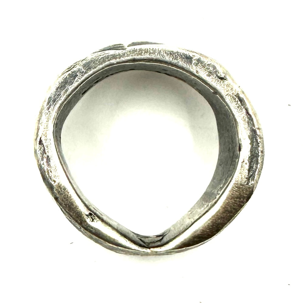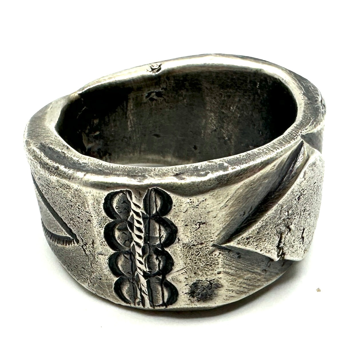 This is a brutalist style heavy large ring stamped and filed by Jock Favour. It can be worn as a ring and or hung on leather as a pendant.