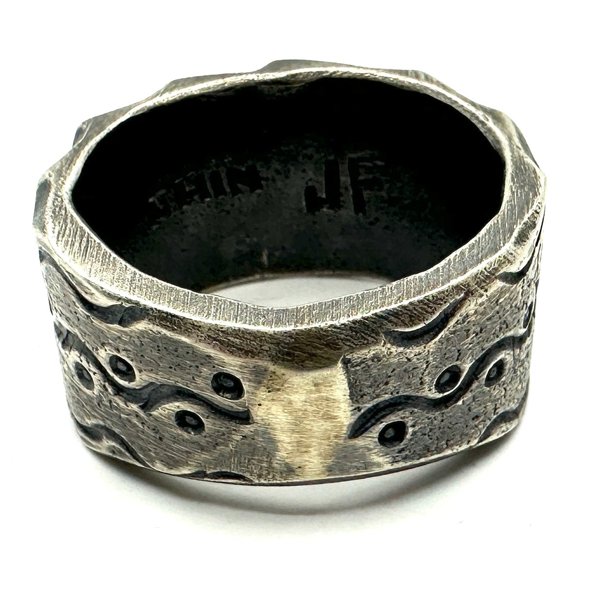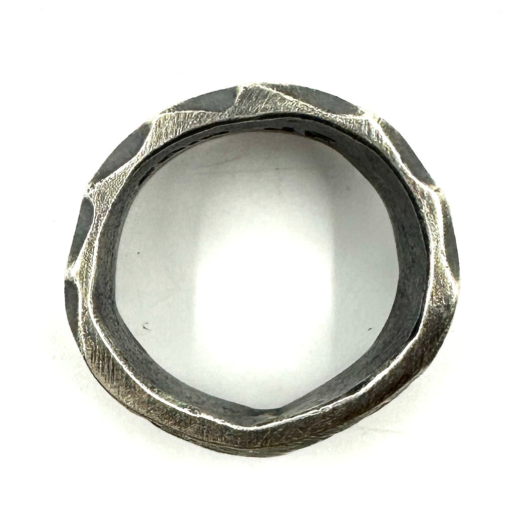 This is a brutalist style heavy large ring stamped and filed by Jock Favour. It can be worn as a ring and or hung on leather as a pendant.