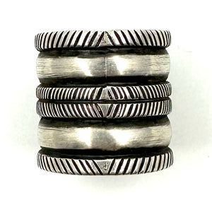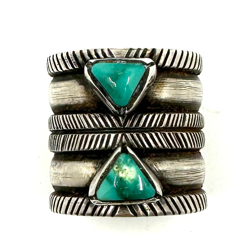 This is a wide coin silver ring with two Fox Turquoise triangle stones by Joe O'Neill of Falcon Trading Company.