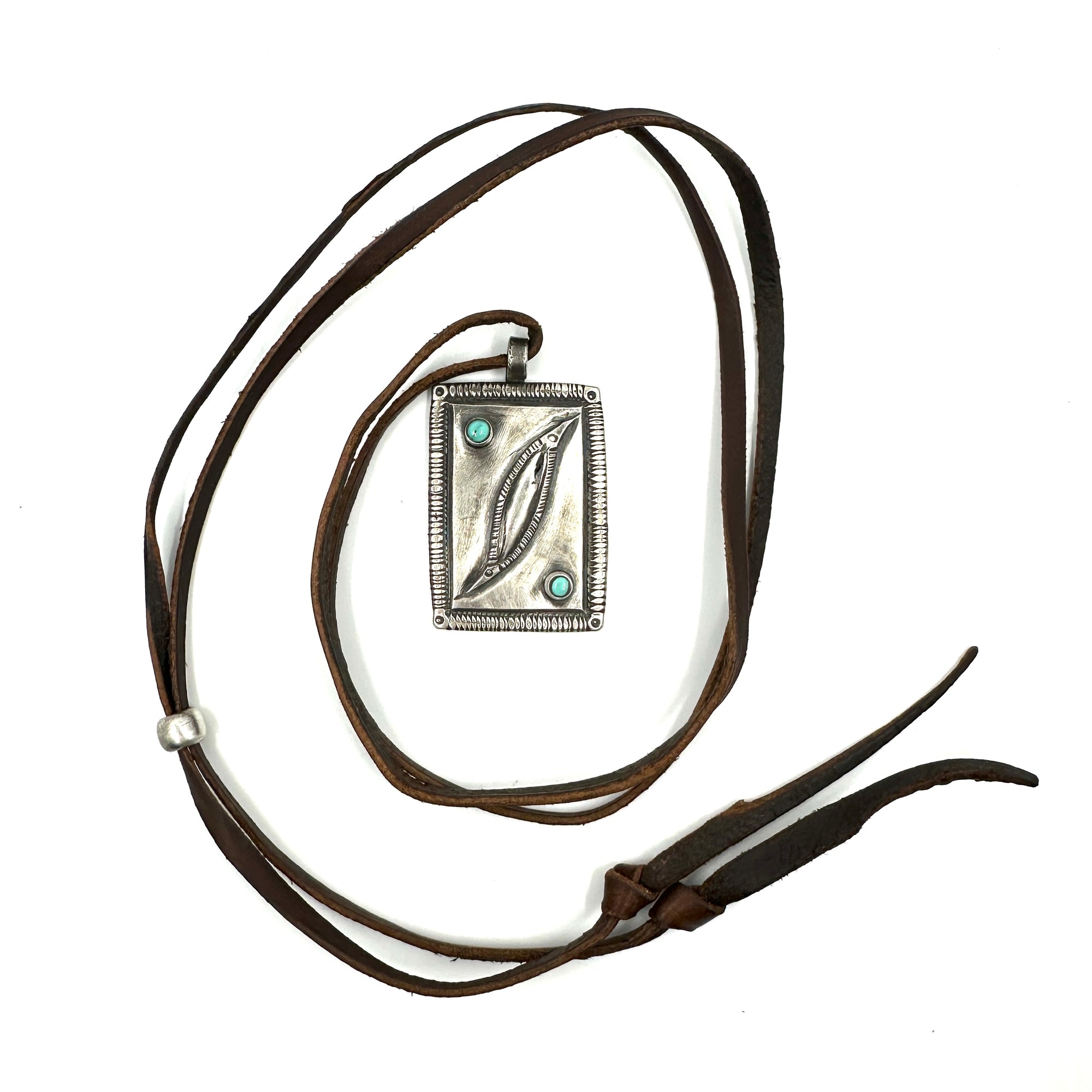 This pendant is hand stamped and filed with a bumped up repoussé design by Joe O'Neill. The plaque is adorned with two Fox Turquoise cabs and is strung on hand-cut deer lace with a silver adjuster bead.